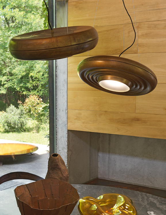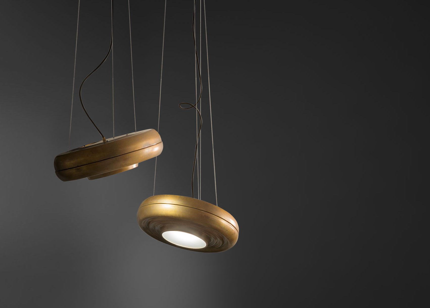 Osvětlovací systém, který modernizuje ručně obráběnenou a leštěnou mosaz, která se používá k vytvoření kupolí. Skládá se ze tří prvků různých velikostí, které mohou být zavěšeny v různých výškách, nebo nastavením tří ocelových kabelů mohou být nakloněny tak, aby změnily intenzitu LED osvětlení.