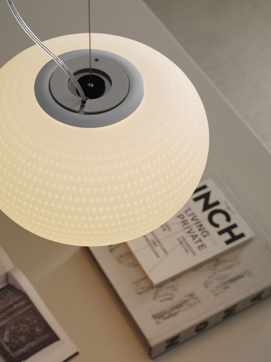 Závěsná lampa Bainca je vybavena difuzérem ze skleněného foukaného skla s mléčně bílým saténovým povrchem. Povrch difuzéru je posetý jemnými drážkami, což přináší fefekt čerstvých stop ve sněhu. Je dotupná ve třech různých velikostech.