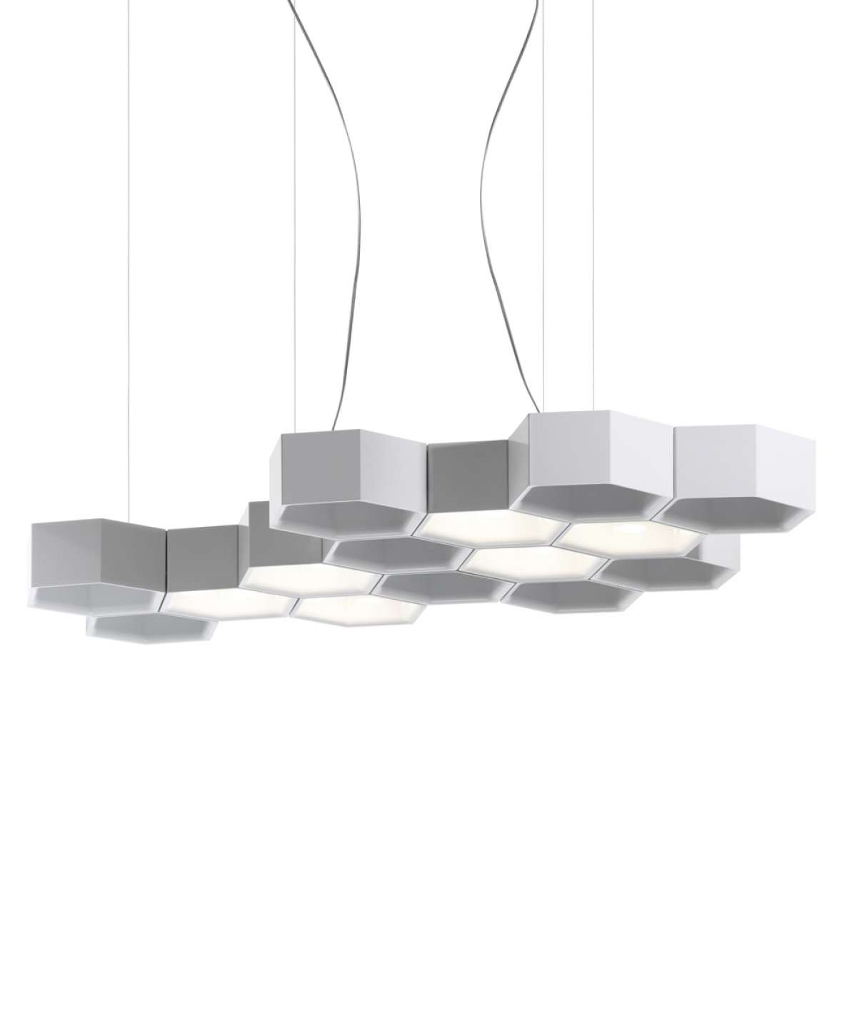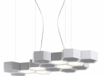Stejně jako buňky úlu jsou hexagonální moduly Honeycomb volně seskupeny do závěsné lampy podmanivé organické symetrie. Šestiúhelníky spojené sponami tvoří samonosnou strukturu, která obsahuje energeticky úsporné halogenové a LED zdroje pro přímé a nepřímé osvětlení.