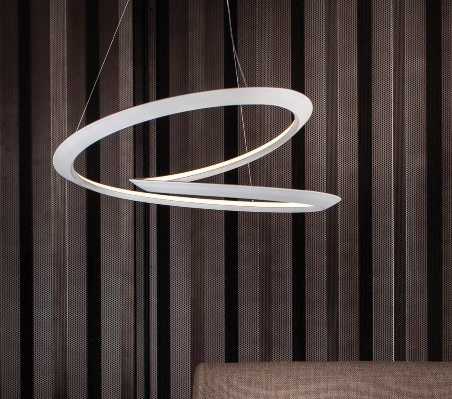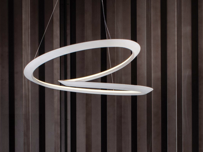 Malá verze Keplerovy lampy. Závěsná lampa z extrudovaného hliníkového prášku. K dispozici ve verzích v bílé, černé a nově zlaté úpravě. Navržena na geometrickém principu Moebiova pásu.