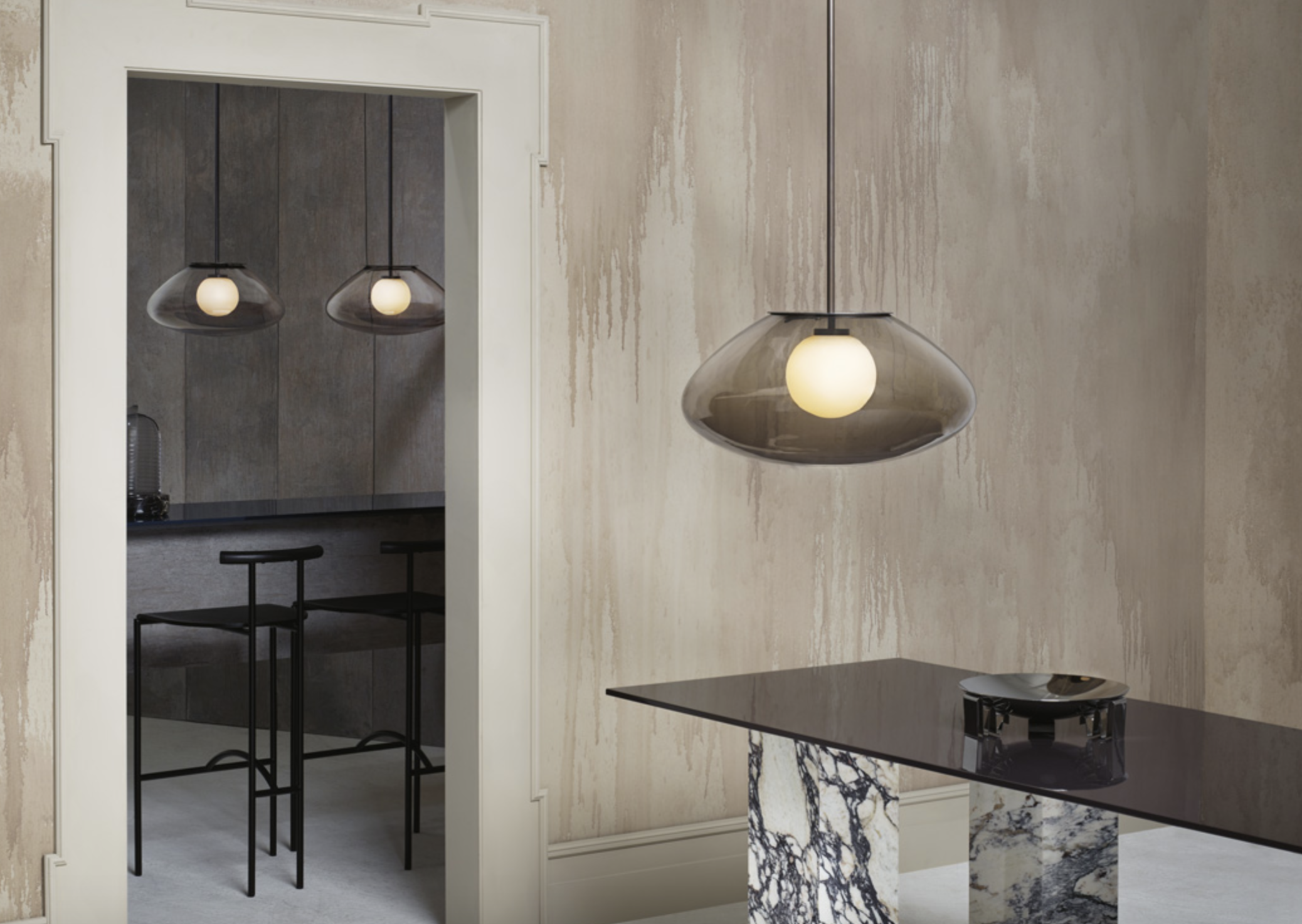 Závěsná lampa Petra dokonale spojuje jemnost a sílu světla. Měkké jádro světla z kouřového nebo opálového skla je uvězněno ve větší zakřivené bublině oblázkovitého tvaru.