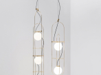 Závěsná lampa z ručně foukaného skla s tenkou kovovou konstrukcí. Na výběr z mnoha tvarových provedení.