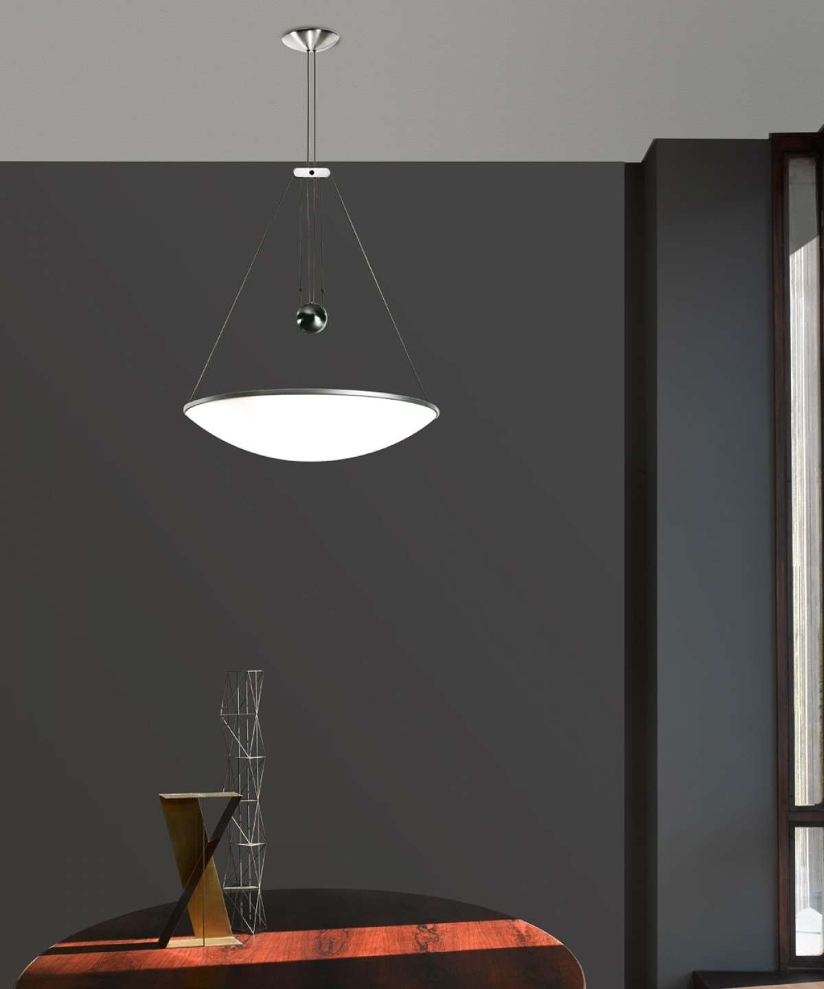 Tvar a sítotisk polykarbonátového difuzéru zvyšují kvalitu světla, které se v prostoru rovnoměrně šíří. Lampa je dodávána ve dvou modelech: s pevnou výškou a výškou nastavitelná díky protizávaží.