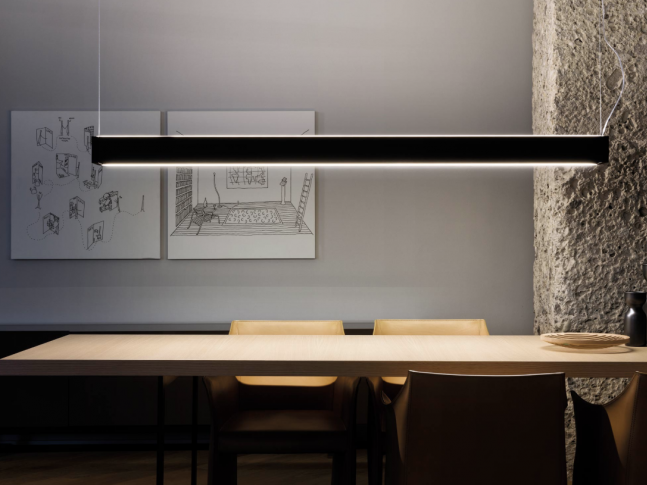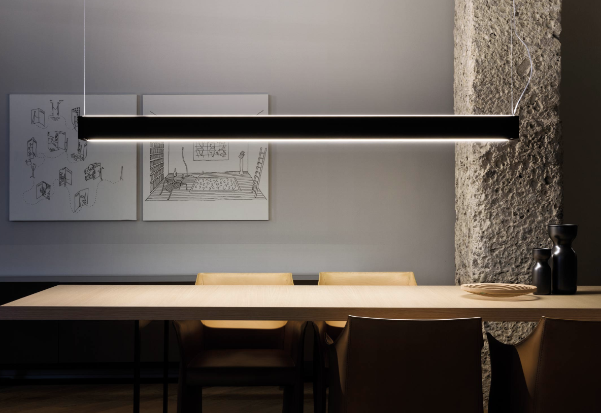 Horizontální závěsná lampa s dvojitým lineárním zdrojem LED. Tělo z extrudovaného hliníku a směsného polymerního materiálu lisovaného vstřikováním, s difuzory v opálovém metakrylátu. Struktura je matně bílá, matně černá nebo titanově šedá.