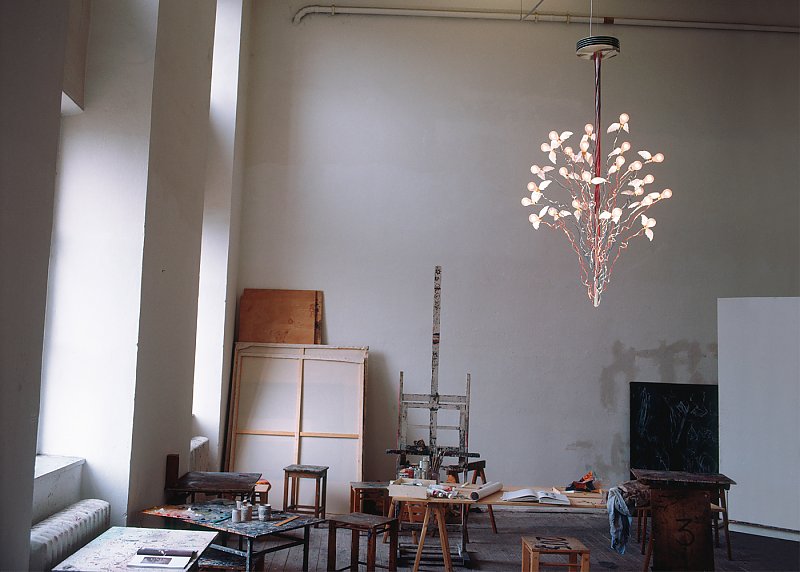Svítidlo se skládá z drátěného torza, dvaceti čtyř žárovek pro nízký proud a křídel z husího peří.