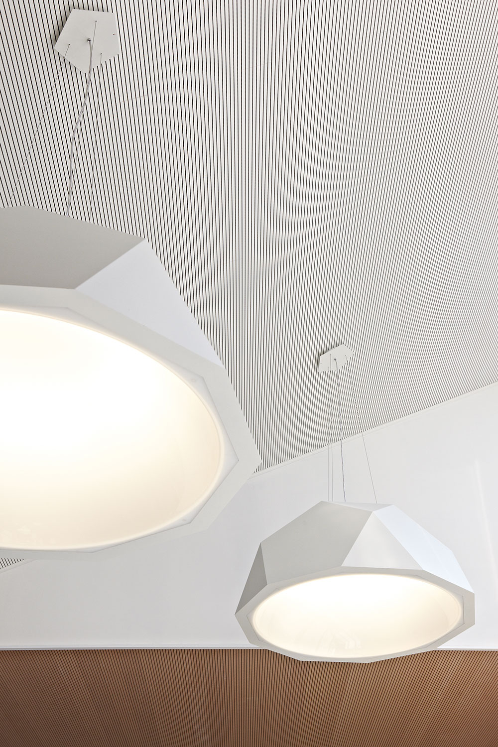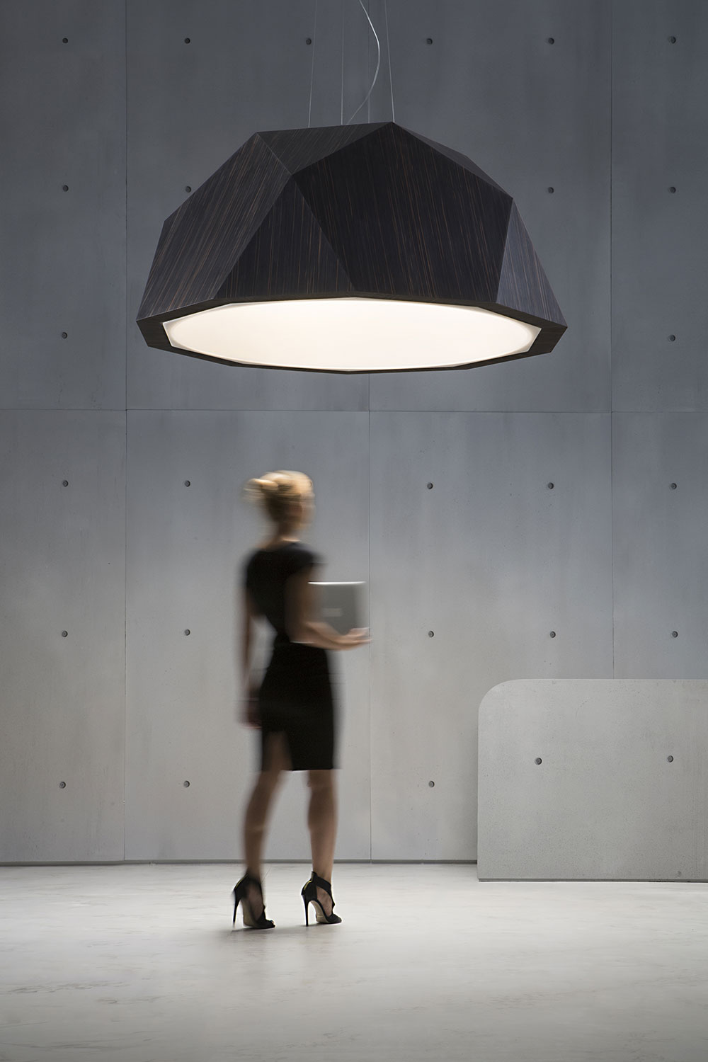 Geometrické závěsné svítidlo. Vyrabí se ve třech barevných variantách.