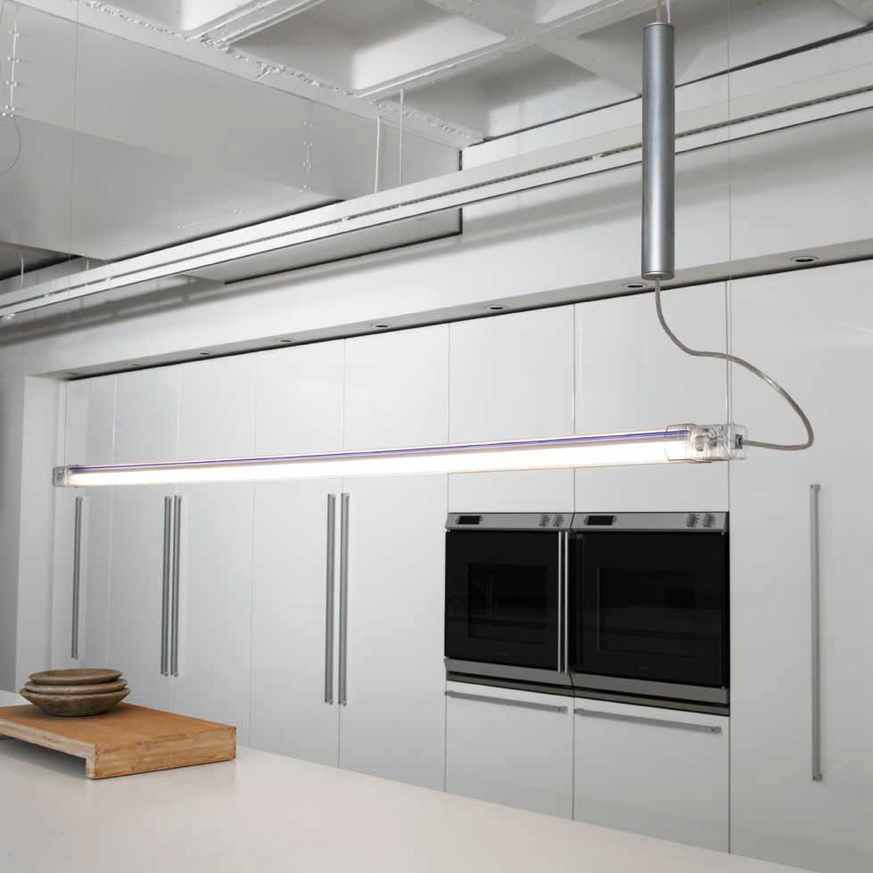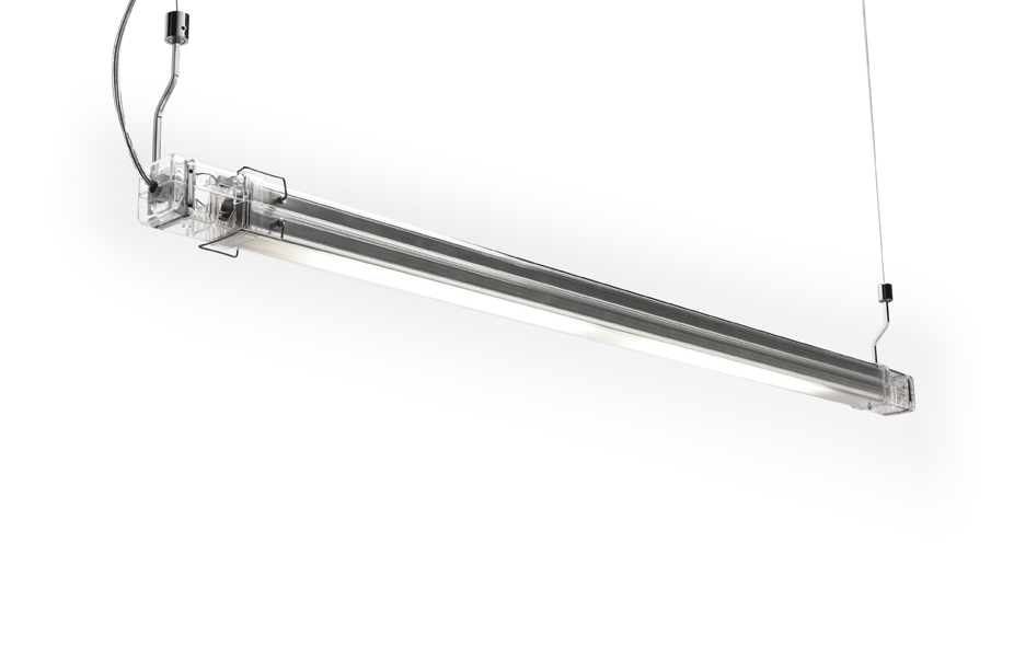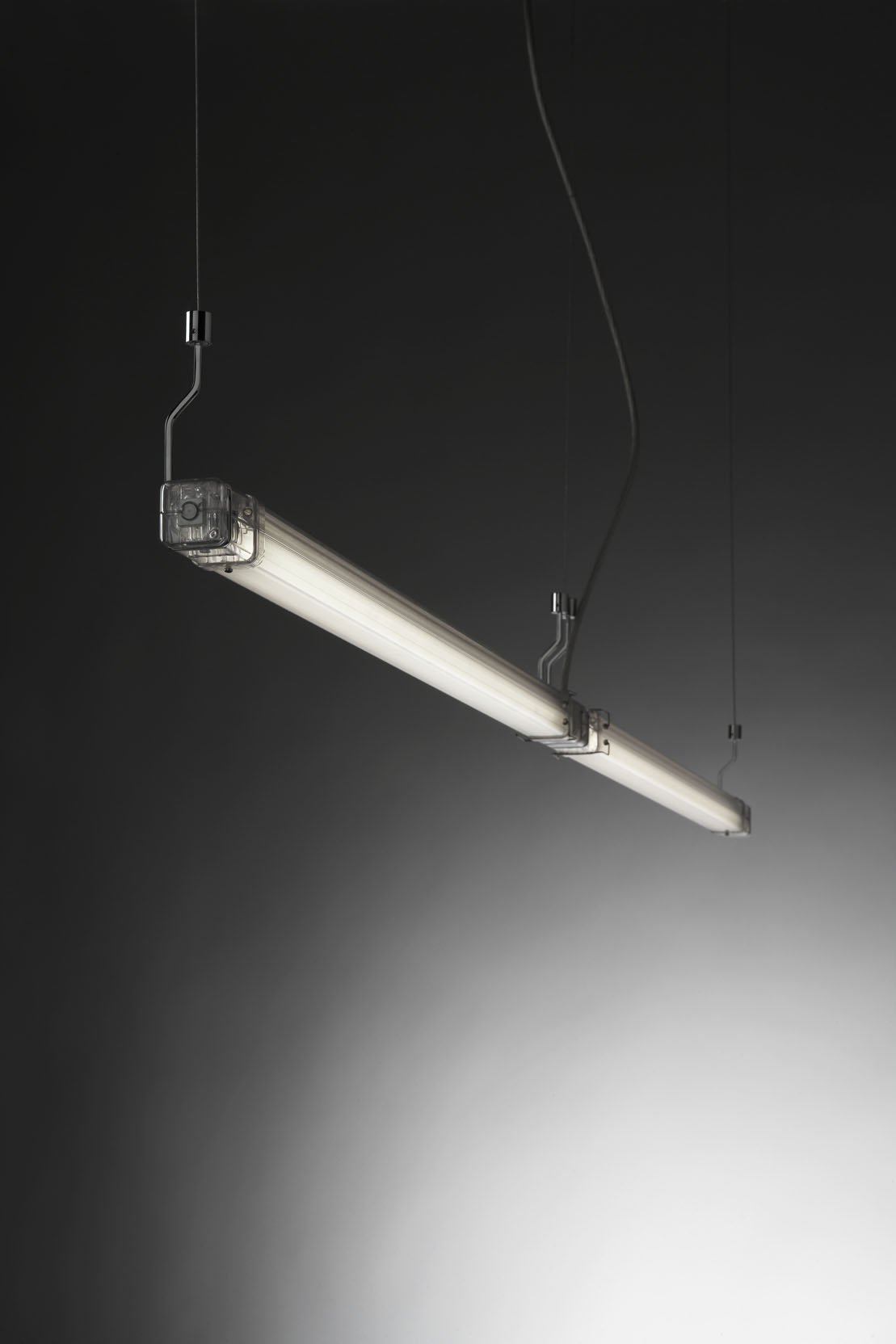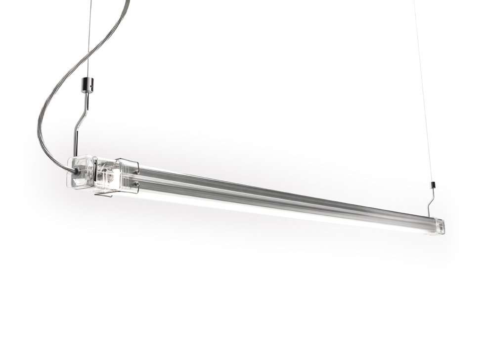 Zvolit si můžete mezi dvěma ekonomickými zdroji – zářivkami a LED páskem. Svítidlo je vyrobeno z průhledného polykarbonátu s decentními chromovými úchytkami. V nabídce také nástěnná varianta. Závěsná varianta v jednoduchém i dvojitém provedení je dostupná ve třech délkách. Design Joan Gaspar pro Marset, 2004.