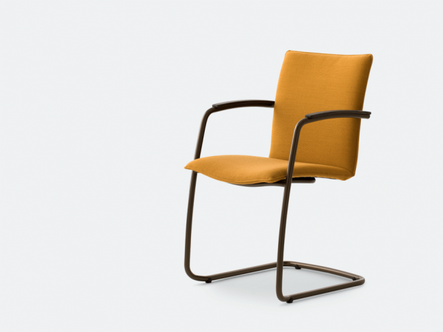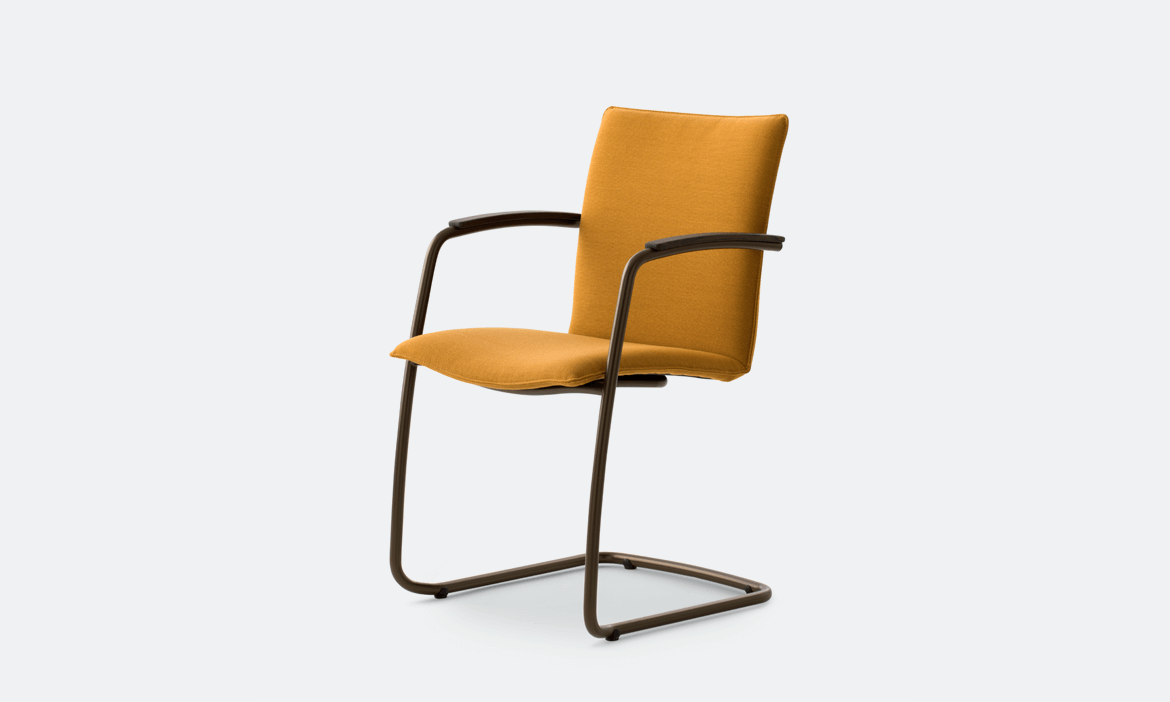 Komfortní odpružené sedadlo této židle je možné jen díky ohnutému trubkovému ocelovému rámu. LX141 je k dispozici s i bez područek z masivního ořechu nebo dubu.