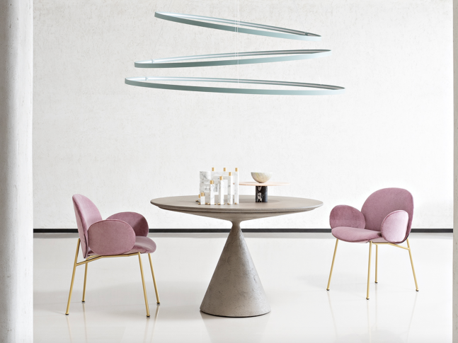 Kolekce Ola se rozšiřuje do jídelny: Židle Ola pochází ze stejného konceptu zakřivených křesel a židlí, z nichž každý se sbíhá směrem ke středovému bodu. Čtyři listy se stávají dvěma listy pro variantu bez područek. Kovový rám má na rozdíl od čalouněného a zaobleného tvaru základní a grafickou siluetu.