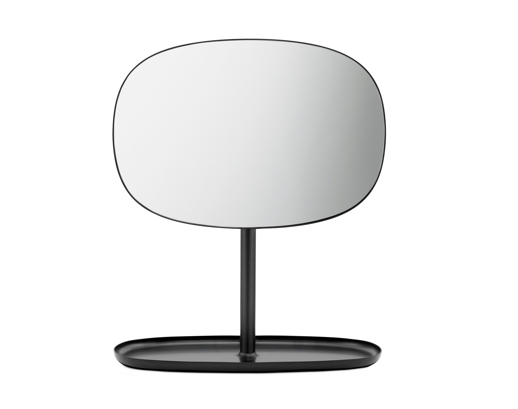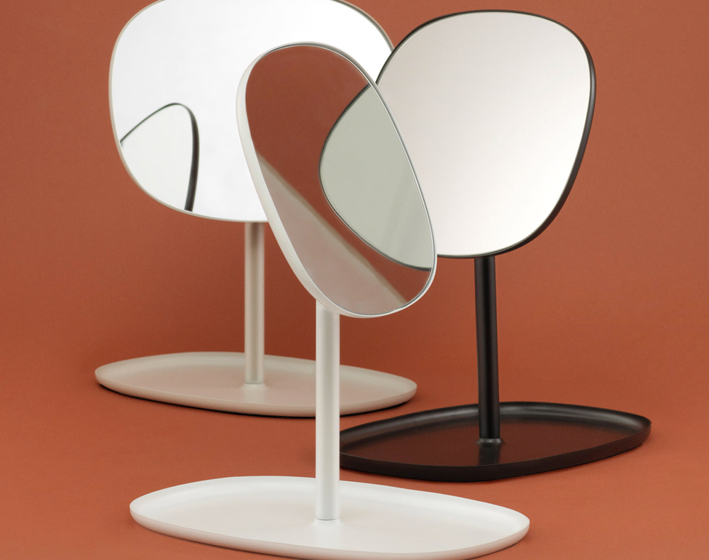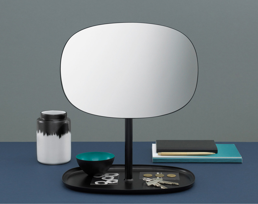 Stolní zrcadlo Flip od Normann Copenhagen lze naklánět nahoru a dolů a otáčet o 360 stupňů. Základnu tvoří tácek, kam můžete uložit šperky, kosmetiku nebo klíče.