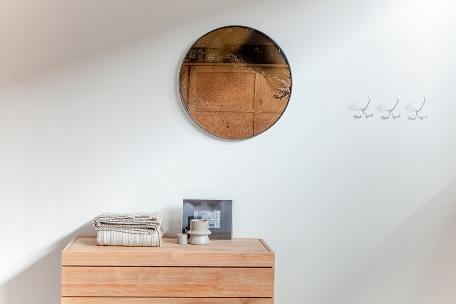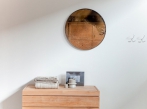 Kulaté nástěnné zrcadlo s dřevěným rámem s odrazem historické patiny, která zaujme na první pohled. K dispozici ve třech velikostech.